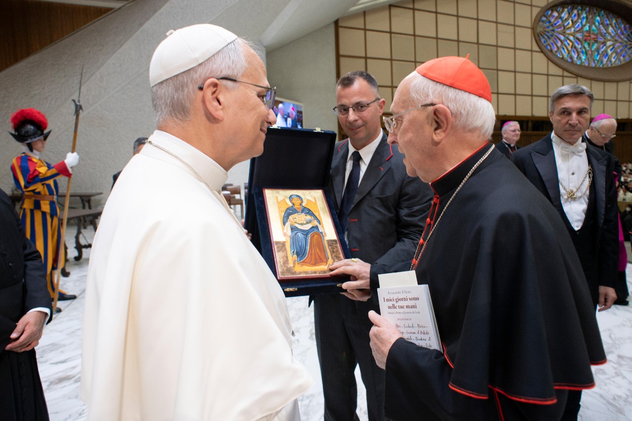 En nombre de los 30 000 miembros de esta institución pontificia, hombres y mujeres, en su mayoría laicos, repartidos en más de 40 países y representados por los peregrinos presentes, procedentes de todos los continentes, el cardenal Filoni entregó al papa un icono de la patrona de la Orden, Nuestra Señora de Palestina —cuya festividad se celebra cada 25 de octubre—, realizado especialmente para él en Tierra Santa por una religiosa de la congregación de las Hermanas de Belén.