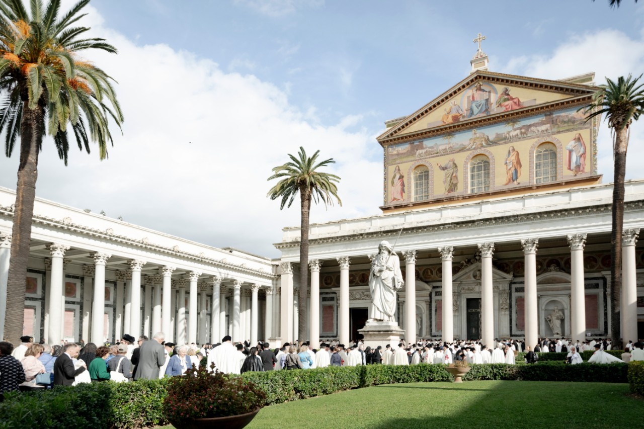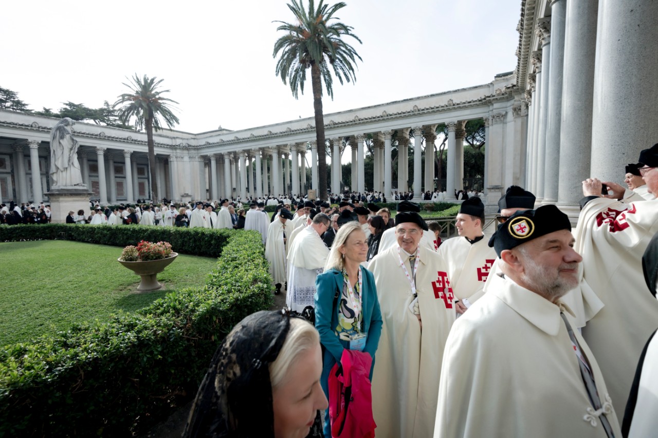 Tras ser recibidos el martes 21 de octubre en sus alojamientos de la ciudad romana por los miembros del personal del Gran Magisterio, los participantes en la peregrinación jubilar asistieron esa misma tarde a la misa de apertura, celebrada en la basílica de San Pablo Extramuros y presidida por el Gran Maestre.